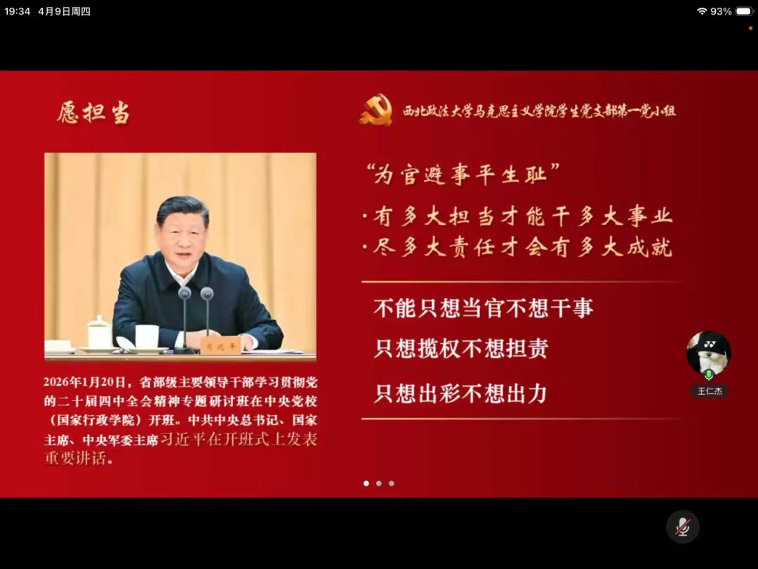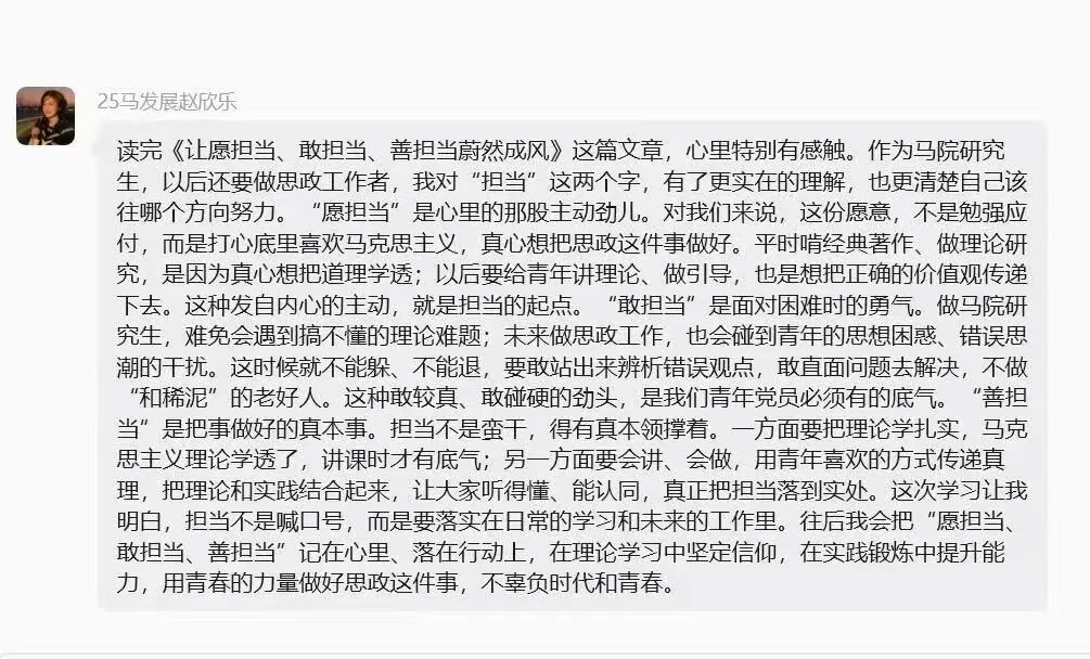 本次专题学习内容充实、组织有序,既深化了理论学习的系统性,也突出了实践导向。全体党员进一步深化了对担当精神的理解认同,明晰了新时代青年党员的职责使命,切实把思想和行动统一到履职尽责、实干争先上来。大家纷纷表示,将以此次学习为新起点,持续深化理论武装,把“愿担当、敢担当、善担当”内化于心、外化于行,立足岗位实干担当,以实际行动践行初心使命,在青春赛道上展现新时代党员的责任与担当。