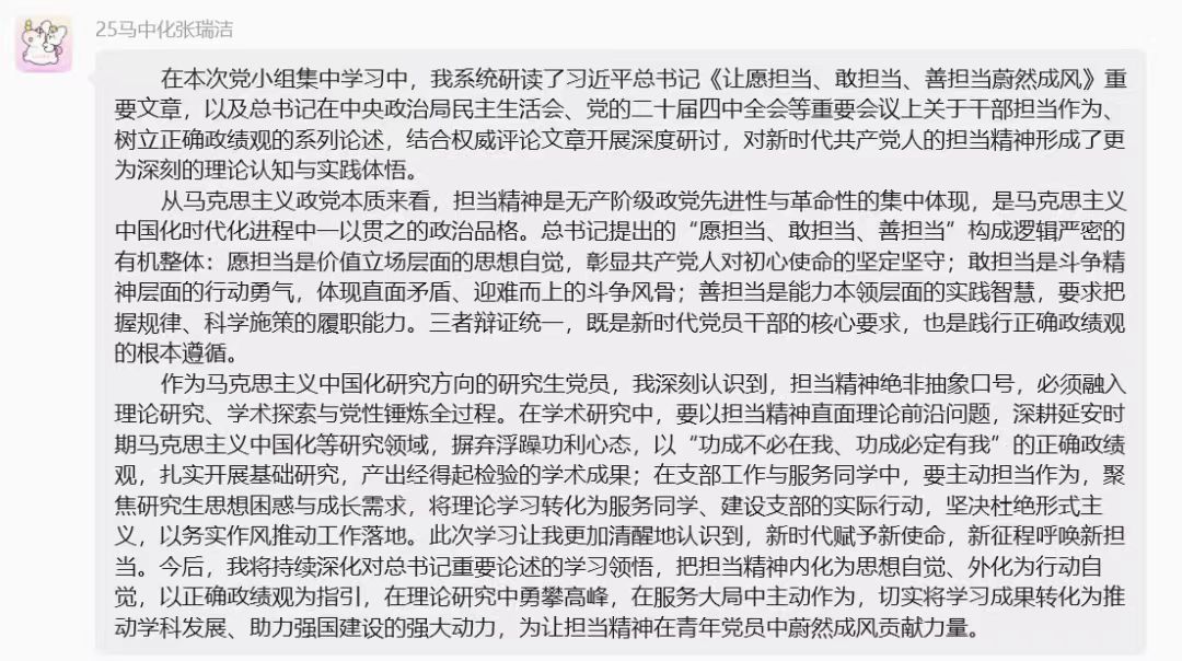 学生党支部以党小组为单位,组织全体党员开展践行担当精神专题教育。三个党小组结合实际、创新形式,推动学习走深走实、入脑入心。