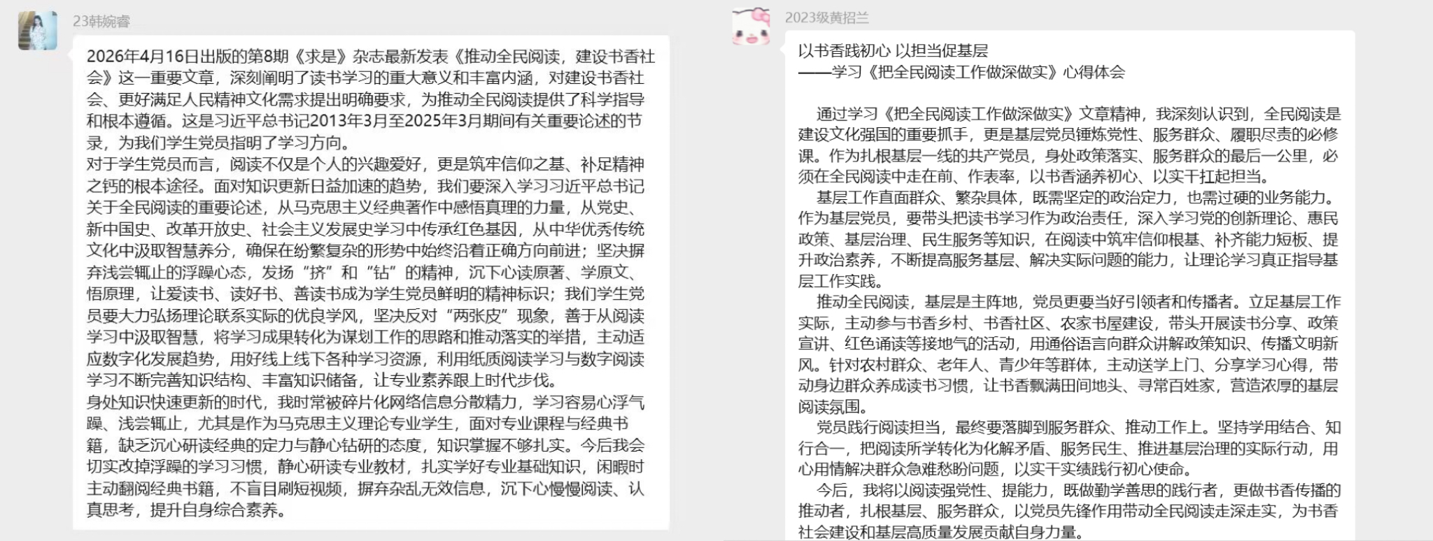 此次专题学习形式灵活、主题鲜明、研讨深入。全体党员在学思践悟中,不仅深刻领会了中央关于推动全民阅读、建设书香社会的战略意义与具体要求,更紧密结合自身作为马院研究生的专业特质,强化了“把读马克思主义经典、悟马克思主义原理当作生活习惯和精神追求”的自觉意识。大家纷纷表示,要将本次学习成果转化为实际行动,以身作则,勤读善思,努力成为书香校园、书香社会的积极倡导者与先行实践者,在未来思政工作中播撒阅读的种子,为深化全民阅读贡献青春智慧与力量。